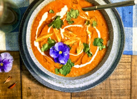 LES BASES DE L’ALIMENTATION AYURVÉDIQUE ILLUSTRÉES PAR VELOUTÉ RÉCONFORTANT AUX DEUX TOMATES, CRÈME DE COCO, CORIANDRE ET ÉPICES BIENFAISANTES : TRIDOSHIQUE (ÉQUILIBRE LES TROIS DOSHAS) – VEGAN – PRÊT EN 35 MINUTES.
