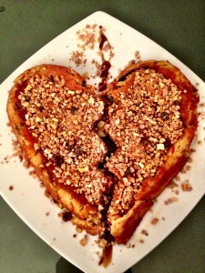 – Pour la déco, badigeonnez le gâteau d’un nappage caramel et parsemez-le du granola restant, poil aux dents. « Brisez » le cœur avec un couteau et remplissez le trou de caramel pour faire une flèche comme sur la photo…