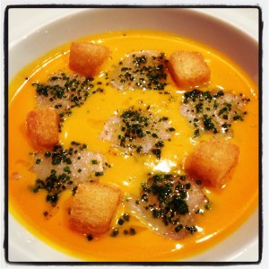Pas faux. Lorsqu’il me tira le bras vers l’entresol du Drugstore, je compris immédiatement : le menteur/sacripant avait réservé à l’Atelier, me voyant systématiquement baver sur le menu dégustation placardé près de la porte d’entrée à chaque trajet vers le métro Etoile. Installés au comptoir avec vue plongeante sur la cuisine ouverte, nous vivons la préparation des assiettes en direct autour d’un verre de Saint-Joseph les Anges 2008 (29 euros). Chic mais pas guindé, moderne mais chaleureux, intime mais pro : voilà sans doute ce qui fait la force et la renommée de l’Atelier.
