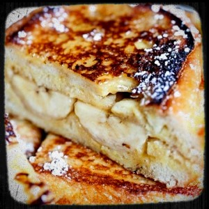 Dans un saladier, on fait faire trempette au pain rassis dans un mélange d’oeufs, de sucres, de miel et de lait. On coupe la banane pourrite dans le sens de la longueur et on la fait revenir dans un poêle graissée, tout en poêlant nos tranchettes de bain généreusement imbibées.